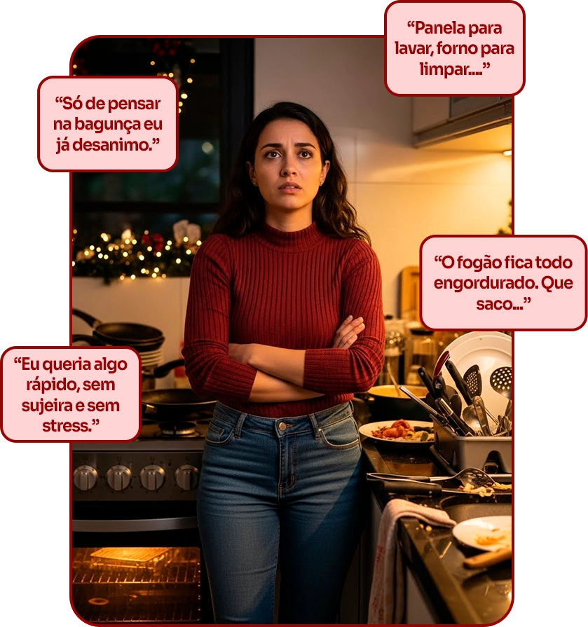 Continuar como sempre: perder tempo na cozinha, sujar panela, sujar fogão, sujar forno, encher a pia de louça e chegar cansada no Natal… tudo isso pra no final ainda correr o risco da comida dar errado. Você sabe onde isso leva: mais stress, mais bagunça e a mesma dor de cabeça de todo ano.